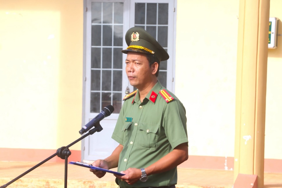 Trưởng công an xã Trung tá Điểu Huỳnh Sơn phát biểu tại buổi lễ