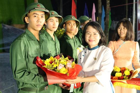 Đồng chí Nguyễn Thị Hồng – Phó chủ tịch UBND xã trao hoa cho các thanh niên trước ngày lên đường nhập ngũ