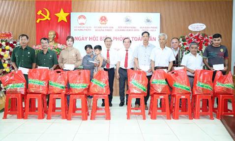 Lãnh đạo xã Hưng Phước trao các phần quà cho hộ dân hai khu liền kề