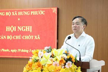 Chiều ngày 19/3, Ban Chấp hành Đảng bộ xã Hưng Phước tổ chức Hội nghị cán bộ chủ chốt nhằm thực hiện quy trình bổ sung Ủy viên Ban Chấp hành Đảng bộ xã, nhiệm kỳ 2025 – 2030. Đồng chí Trịnh Tiến Tâm – Bí thư Đảng ủy, Chủ tịch HĐND xã chủ trì hội nghị.