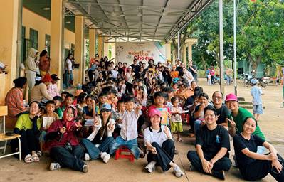 Đoàn từ thiện chụp hình lưu niệm cùng thầy cô cùng các em học sinh