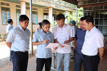 Đồng chí Nguyễn Công Danh - chủ tịch UBND cùng phòng ban chuyên môn liên quan kiểm tra các hạng mục Trường Tiểu học và Trung học Cơ sở Hưng Phước