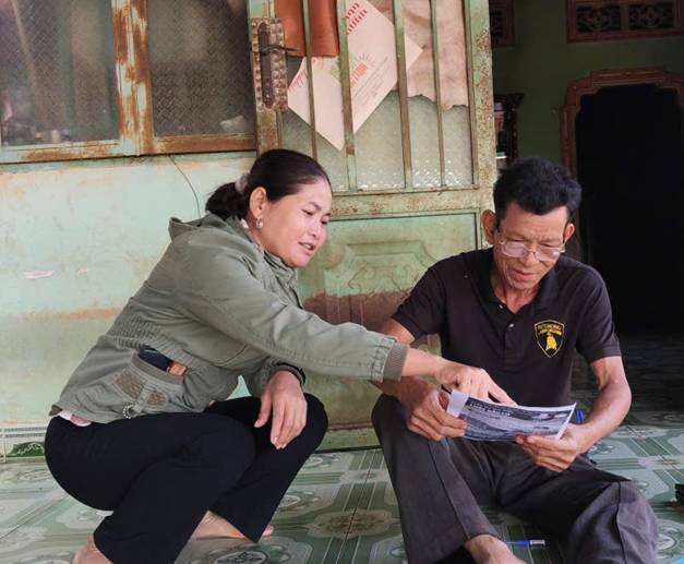 Chị Điểu Thị Kim Thoa ( áo xanh rêu)- Chi hội trưởng phụ nữ tuyên truyền về các cuộc thi trực tuyến tìm hiểu Luật bầu cử đến người dân ấp Phước Tiến
